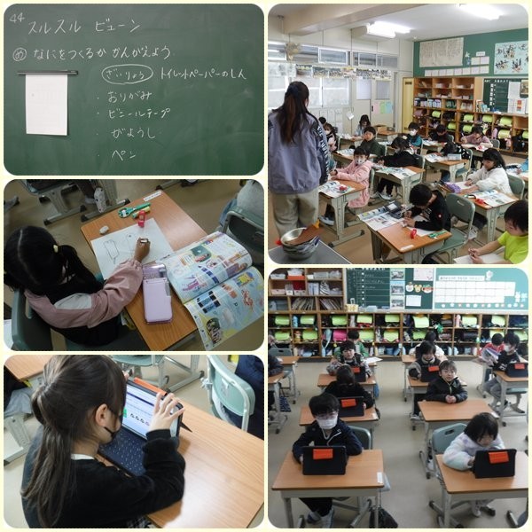 1組は図画工作の授業で、「スルスル ビューン」の教材で、何を作るかのアイデアを考えていました。