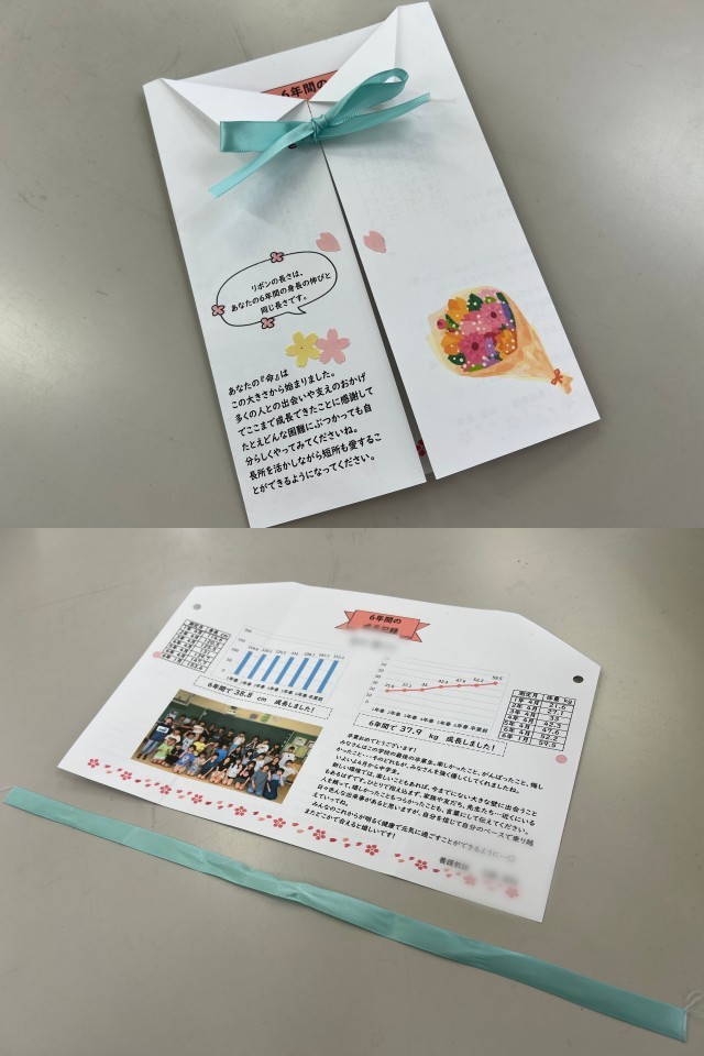 1年生から6年生までの身長・体重の記録が丁寧にまとめられ、歩んできた時間と確かな成長が感じられるものでした。添えられたリボンの紐は、身長の伸びを表し、数字だけでは伝えきれない成長の大きさを物語っていました。小さな体で入学した子どもたちは、心も体も大きく成長し、今では頼もしい高学年です。楽しいことだけでなく、悩みや不安を抱えることも多かった6年間。保健室で養護教諭に相談し、気持ちを受け止めてもらった子もたくさんいたことでしょう。