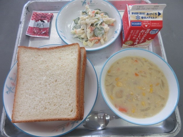 『スライスパン・牛乳・豆乳コーンスープ・マカロニサラダ・大豆チョコ』です!