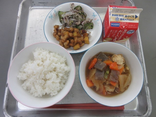 『ごはん・牛乳・生揚げの吹き寄せ・大豆とさつまいものごまがらめ・しめじとあかじそサラダ』です!