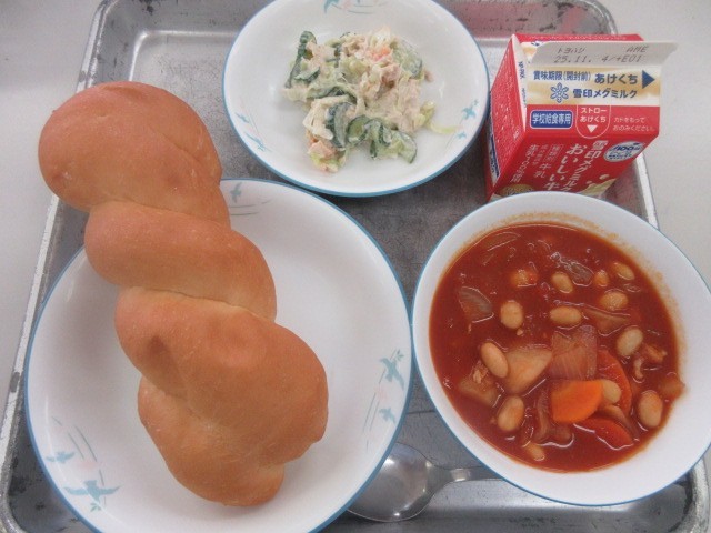 『愛知のツイストパン・牛乳・ポークビーンズ・ツナサラダ』です!