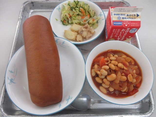 『黒ロールパン・牛乳・ポークビーンズ・タラポテのカリッと塩味・キャベツとアーモンドのサラダ』です!