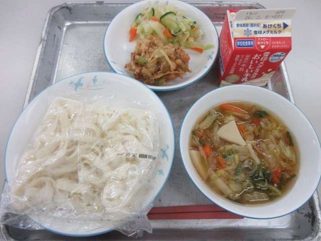 『きしめん・牛乳・きしめんの汁・大豆とごぼうのかき揚げ・たくあんあえ』です!