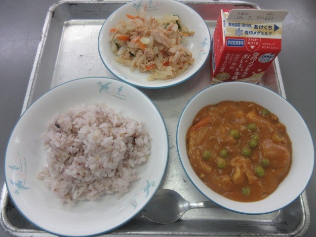 『麦ごはん・発酵乳・カレー・チキンサラダ』です!