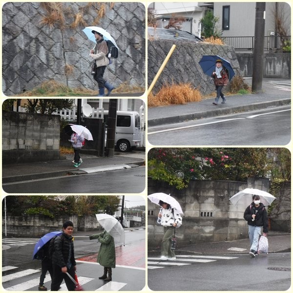 傘を持って原山っ子たちが登校してきました。雨に負けず今日も1日頑張りましょう!