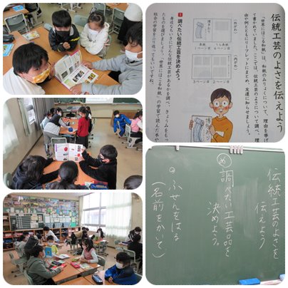 「伝統工芸のよさを伝えよう」という単元で、グループに分かれて何を調べるかを話し合っていました。