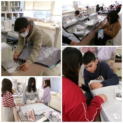 5年生の家庭科は初めてミシンで作品作りです。エプロンを作っています。