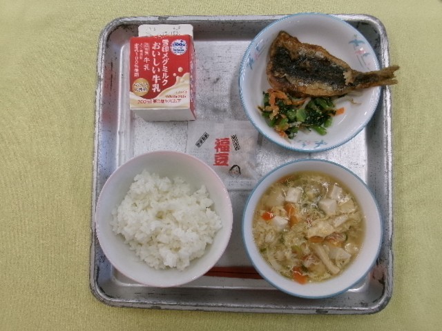 ごはん 牛乳 かきたま汁 いわしの蒲焼き 小松菜のごま酢あえ 節分豆 です。