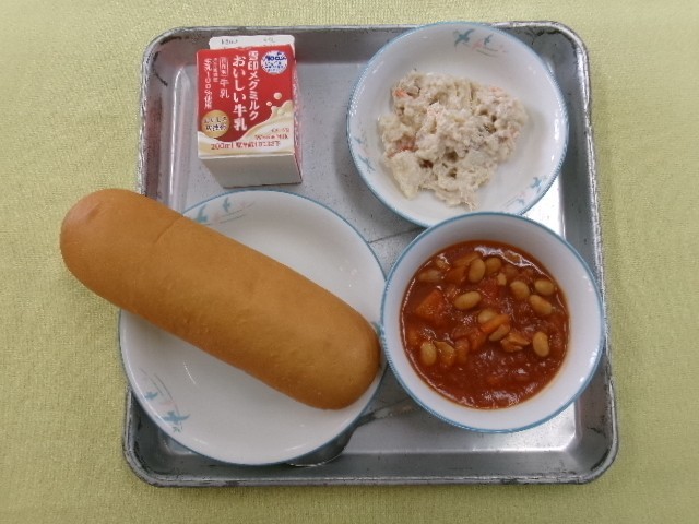 ロールパン 牛乳 チキンビーンズ りんごのポテトサラダ です。