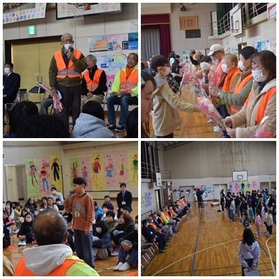 お世話になった調理員さんや地域の方に感謝を込めて花や校歌をプレゼントしました。