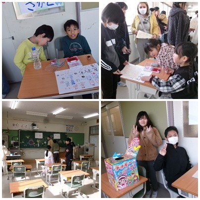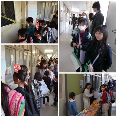 子どもたちのお店が開店しました。おばけやしきは大人気です。今まで入ったことがない子が多いようで、とても楽しみにしていたようです。千本引きは豪華景品がたくさんそろっていたようです。引くまでのおたのしみは、わくわく感満載でした。宝探しは低学年が受付をがんばっていました。1年生も入学してまもなく1年。ほんとうに頼もしくなりました。