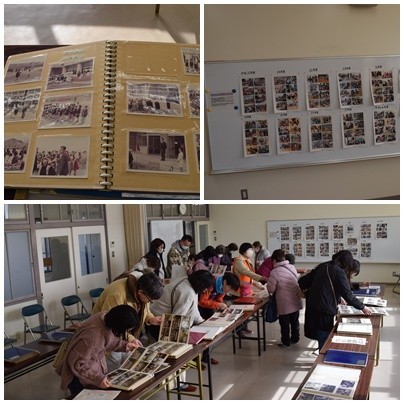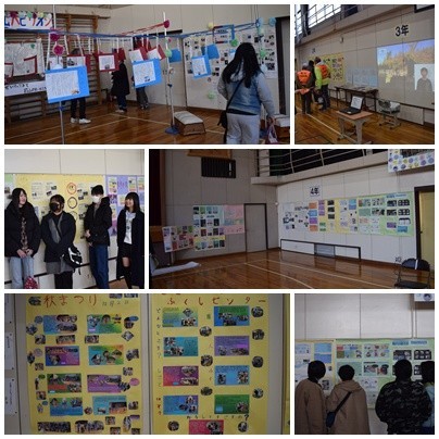 なかよしルームでは「歴史コーナー」として、開校時からの記録写真などを公開しました。保護者の中には本校の卒業生もいらっしゃいます。在学時のアルバムを懐かしそうにめくっていました。また、今日は高校生の姿も多く見かけました。取材に来ていたケーブルテレビのインタビューにこたえていたり、校舎の中を楽しんだりしていました。体育館では、この1年の子どもたちの学習のまとめを展示しました。これも多くの方に見ていただくことができました。