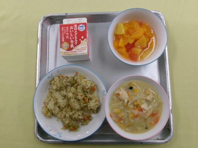 カレーピラフ 牛乳 豆乳スープ フルーツポンチ です。