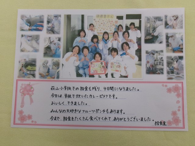 最後の給食でした。調理員さん、今日までおいしい給食を本当にありがとうございました。