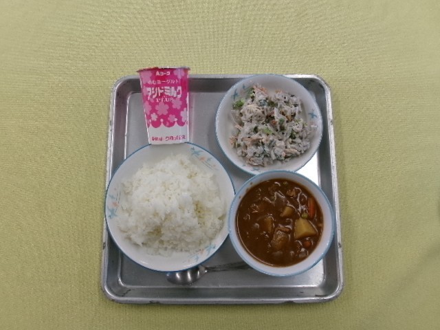 ごはん 発酵乳 ハヤシシチュー れんこんサラダ です。