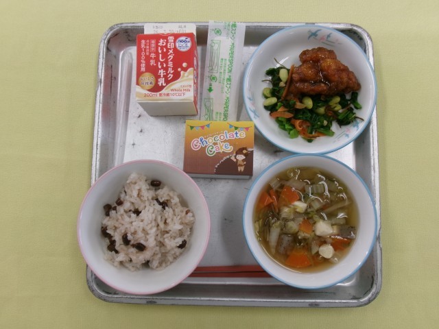 赤飯 牛乳 じゃがいもののっぺい汁 鶏肉のてりかけ 小松菜の昆布あえ 米粉と豆乳のココアケーキ です。