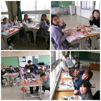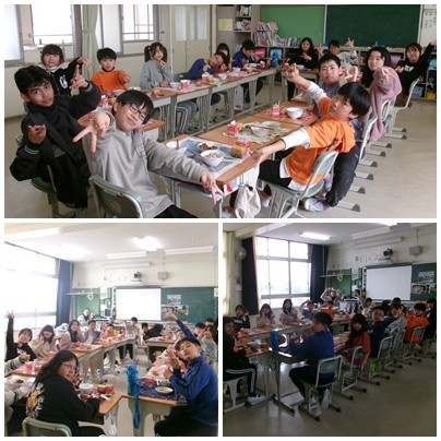 今日は栄養の先生や調理員さんたちからあたたかいメッセージが届きました。ありがとうございました。こんなおいしい給食をいただくのもあとわずか。最後までのこさず味わっていただきましょう。