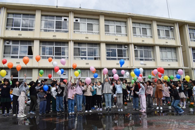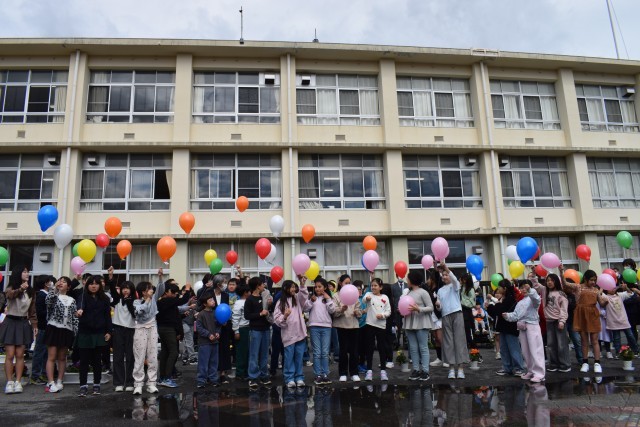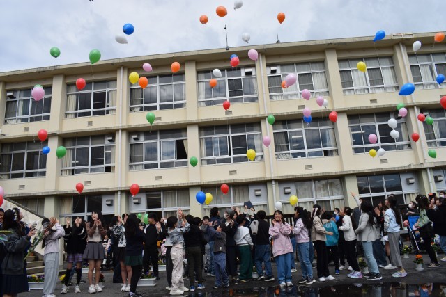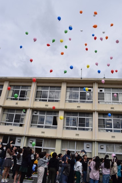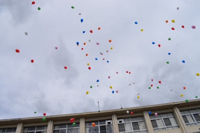 見送りの後、本当に最後の日、閉校の日を記念して、風船を飛ばしました。