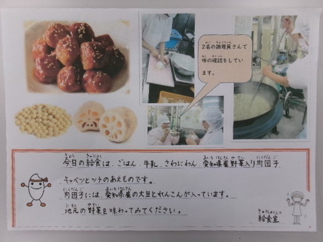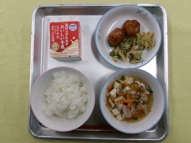 ごはん 牛乳 愛知県産野菜入り肉団子 キャベツとツナのあえもの です。
