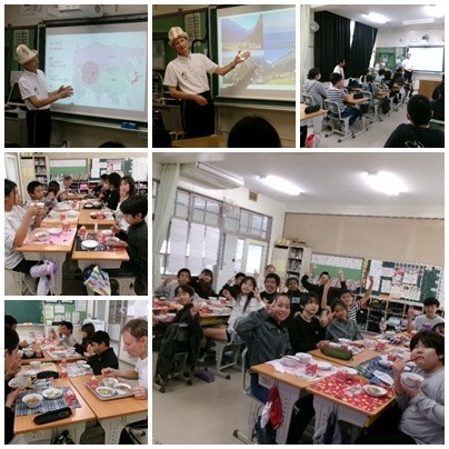 今日の午後はパラアスリート学校訪問です。それを運営しているところにキルギス出身の方がいらっしゃいます。学校訪問前に国際文化交流として、レナトさんからキルギスの紹介の授業を6年生にしていただきました。授業の後は給食だったので、一緒に時間を過ごしました。