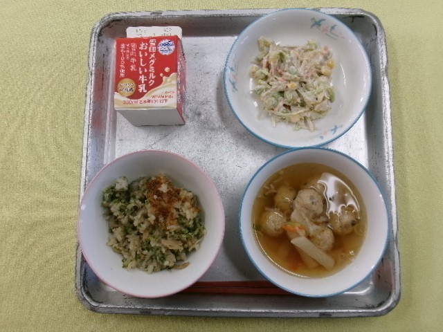 まごはやさしいきつねごはん 牛乳 鮭団子汁 ごぼうサラダ です。