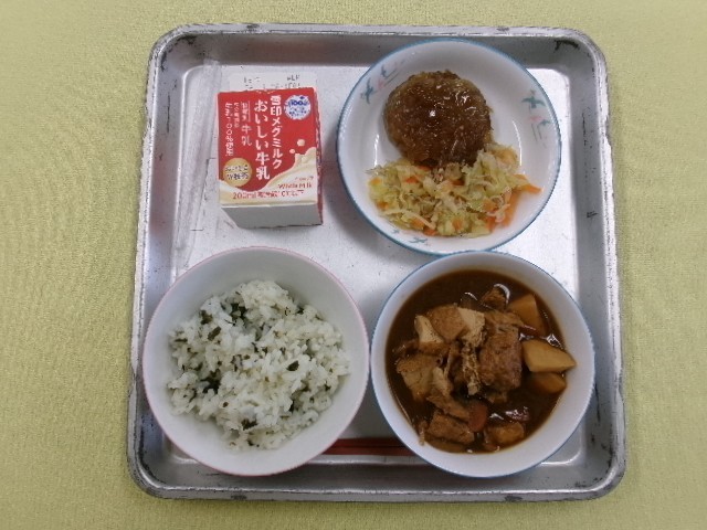 わかめごはん 牛乳 根菜と厚揚げのみそ汁 ハンバーグのたまねぎソースかけ しらすあえ です。