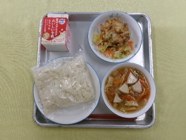 きしめん 牛乳 きしめんの汁 大豆とごぼうのかき揚げ たくあんあえ です。