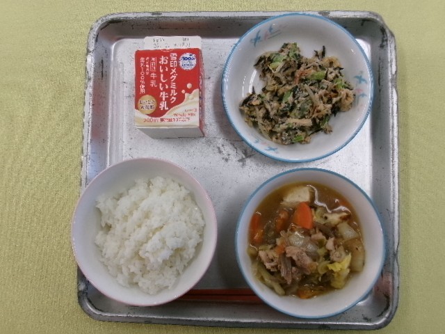 ごはん 牛乳 ひきずり 五色あえ です。