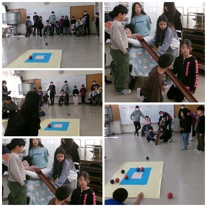 3時間目は3年生が交流会をしました。チーム対抗のボッチャです。1球1球に歓声が響き渡りました。