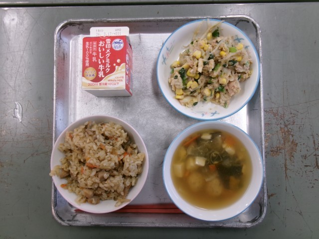 とりめし 牛乳 鮭団子汁 五色あえ です。