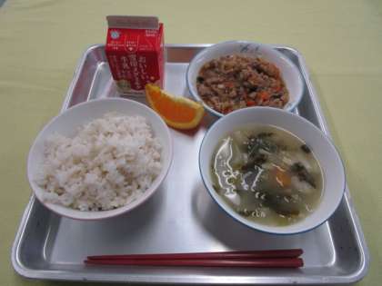 麦ごはん、牛乳、トックスープ、野菜豚丼、オレンジ
