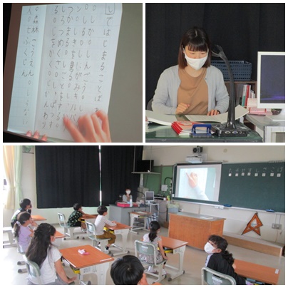 5月12日(木)1年生が国語の授業をしていました。拡大投影機でノートを黒板にうつしていました。ノートを指し示しながら、児童が質問に答えていました。プロジェクターを使っていろいろな形の授業ができますね。