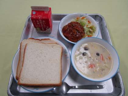 スライスパン、牛乳、コーンクリームシチュー、ハンバーグのきのこソースかけ、彩りキャベツ