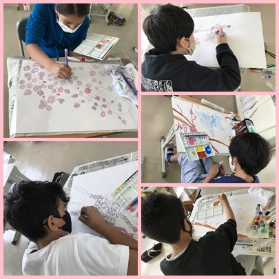 先日、5年生が南公園で写生をしました。今日はその作品に彩色をしていました。画用紙に春のきれいな色が浮かび上がりました。