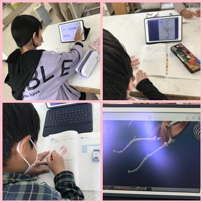 4年生が理科の学習で「動物の体のしくみ」を勉強していました。動物の骨・関節・筋肉のつき方をタブレットを使って観察して、スケッチしました。