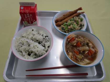 わかめごはん、牛乳、すき煮、子持ちししゃもフライ、キャベツとささみのあえもの
