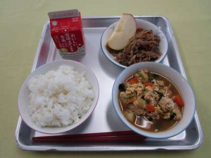 ごはん、牛乳、凍り豆腐の卵とじ、根菜きんぴら、りんご