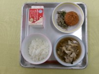 ソフト麺、牛乳、カレーあんかけ、タコとジャガイモののり塩炒め