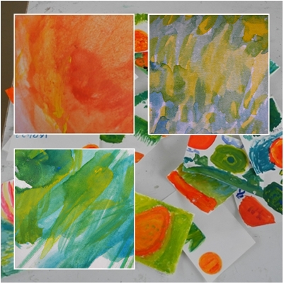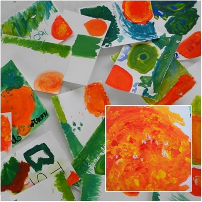 3年生は,「絵の具2色で100色つくろう」をめあてに,夕焼け空と野原をイメージして描いてみました。