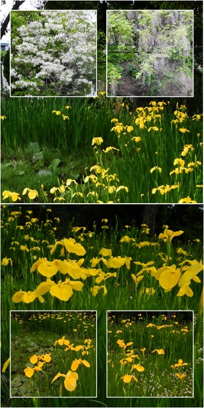 月の満ち欠けの暦では,今日が弥生(やよい:三月)三十日,月が替わり明日は卯月(うづき:四月)一日となります。学校の花たちもバトンタッチです。藤(ふじ)やなんじゃもんじゃの色が消えていく中,トンボ池の黄菖蒲(きしょうぶ)が鮮やかに咲き誇っています。
