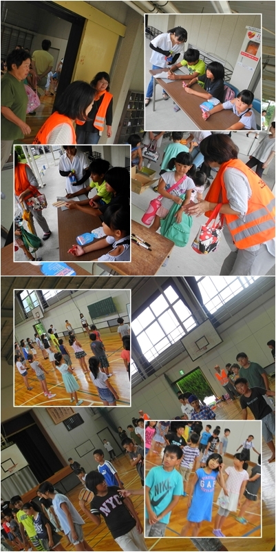 高学年が受付係を引き受けて,出席カードにスタンプを押し,名簿でチェックをしています。90人近くの人数が集まりました。