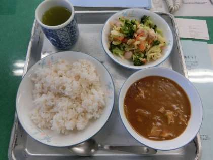 本日の給食のメインは、冬野菜のカレーです。萩山小では、材料のさといもを地元の方が育ててくれた「ちびっ農園」のさといもを提供していただきました。