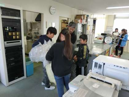 昨日、古くなって買い直した体育館のパイプ椅子が、納入されました。清掃の時間に、子どもたちが手伝って、梱包をとき指定の場所へ納めてくれました。