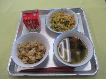 今日の給食は韓国風です。キムチが苦手な子もいますが、豚肉と炒めると味が変わり、食べやすくなるので、子どもたちにも人気の一品です。