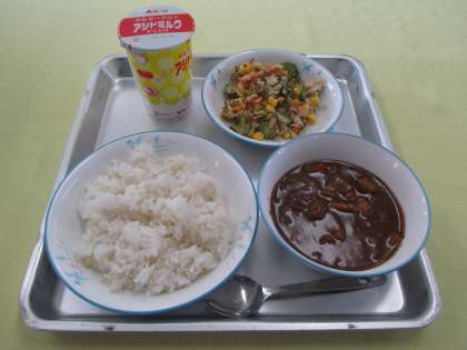 麦ごはん、発酵乳、ハヤシシチュー、いろどりサラダ