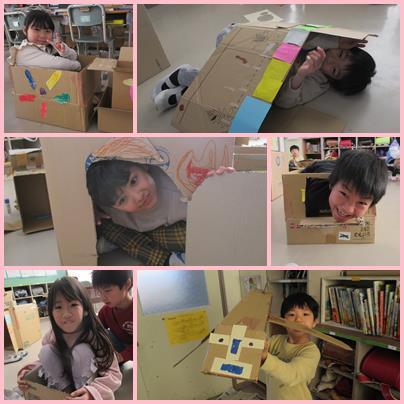 2年図工「段ボールに入ったよ」