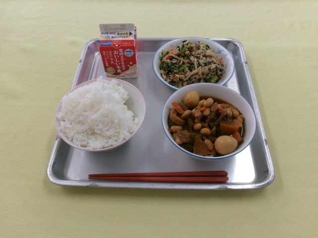 ごはん 牛乳 うずら卵の煮みそ 五色あえ です。