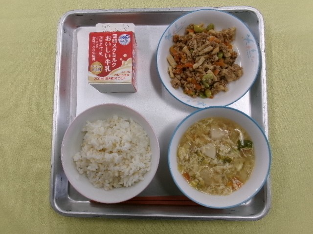 玄米ごはん 牛乳 かきたま汁 凍り豆腐のそぼろ丼 です。