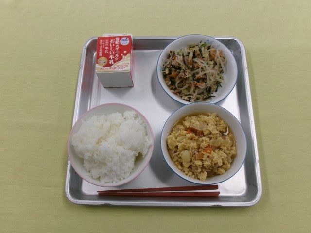 玄米ごはん 牛乳 かきたま汁 凍り豆腐のそぼろ丼 です。