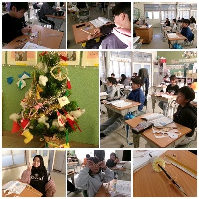 1年生は図工の時間にクリスマスツリーを作りました。まつぽっくりがツリーになります。
